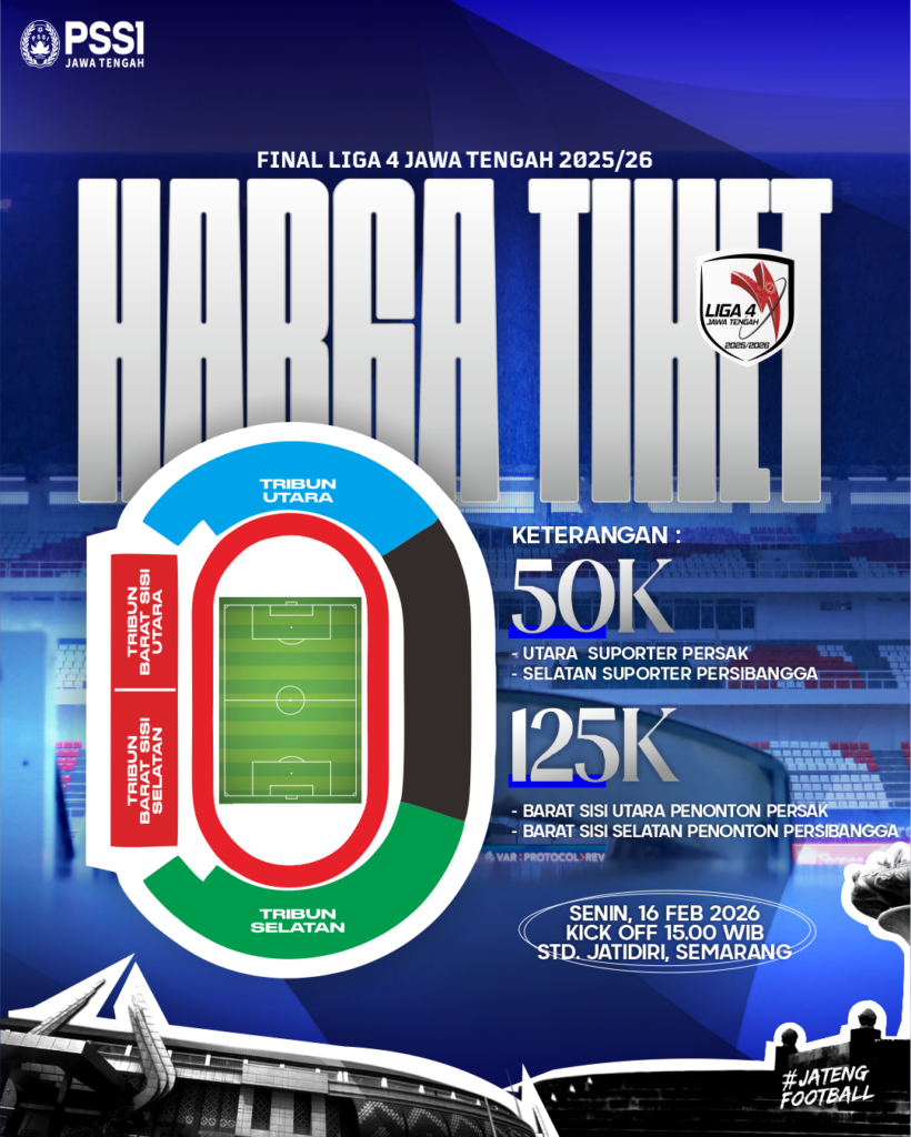 Semarang, PSSIJateng.com – Partai puncak Liga 4 Jawa Tengah 2025-26 antara Persak Kebumen menghadapi Persibangga Purbalingga akan digelar di Stadion Jatidiri, Kota Semarang pada Senin (16/02) sore mendatang.